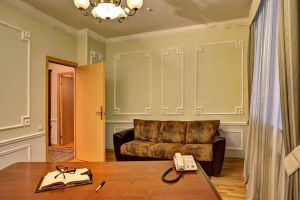 Номер состоит из трех комнат: просторного холла, гостиной с плазменным телевизором, кабинета для деловых переговоров и уютной спальни с изысканной итальянской мебелью.​